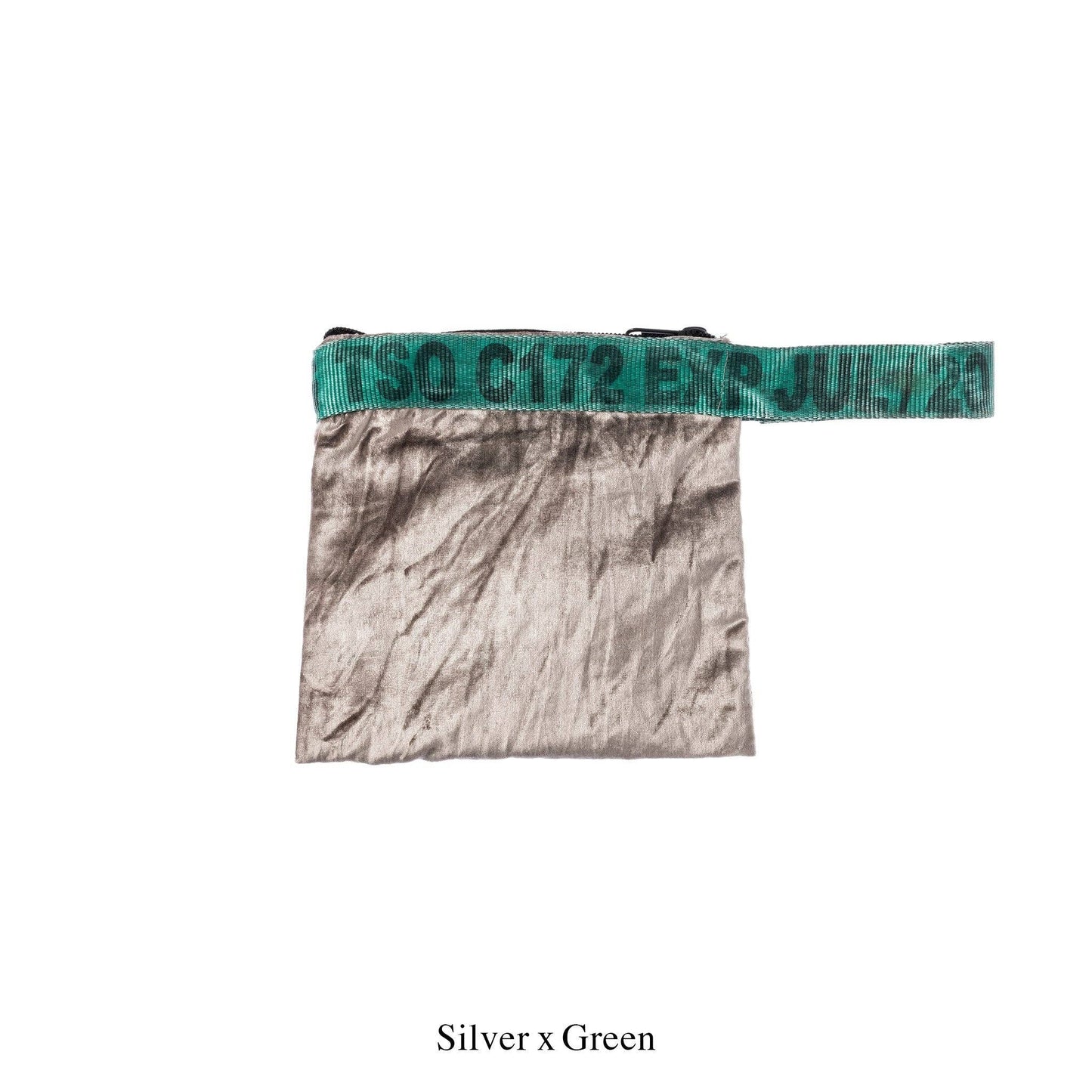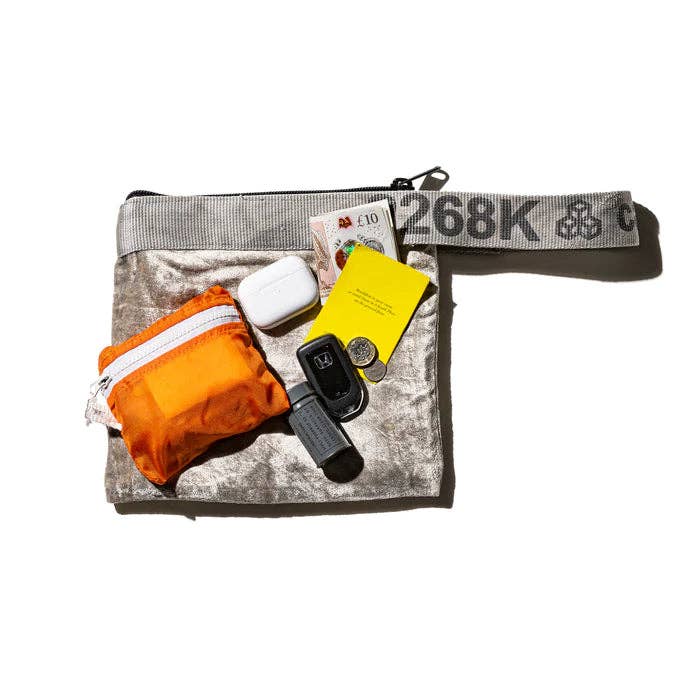 Collecting surplus materials found at construction sites and manufacturing factories in India, this pouch was born. The vintage belt adds a touch of rugged charm to this soft velvet pouch.