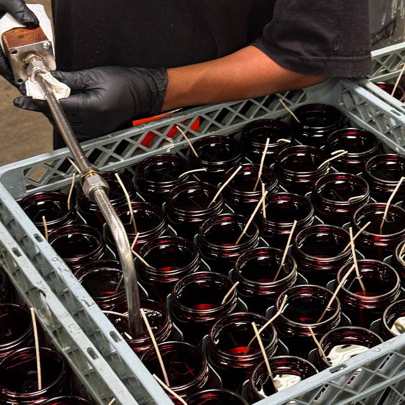 Poured into 7.2 oz bordeaux-toned glass jars with medieval-inspired gilded accents. They're all made with 100% domestically grown soy wax, fine fragrance oils, and cotton-core wicks. The fragrances used are paraben-free, phthalate-free, and never (ever) tested on animals. Burns for 40-50 hours.