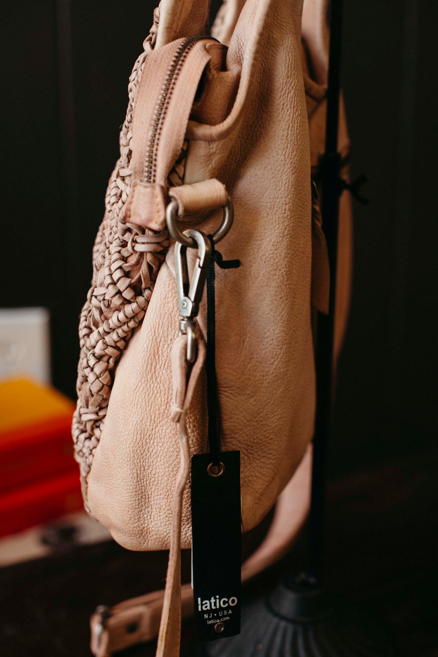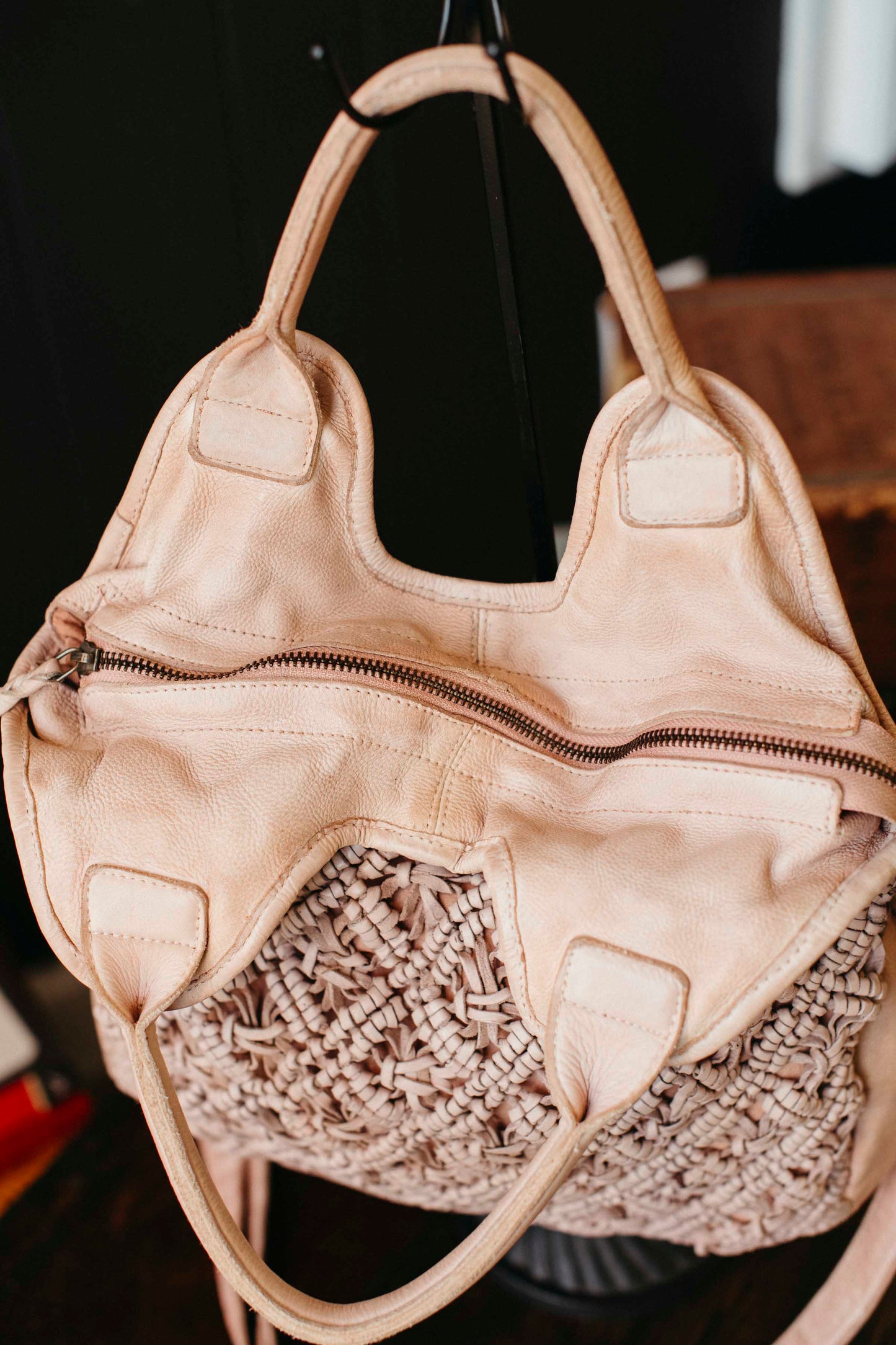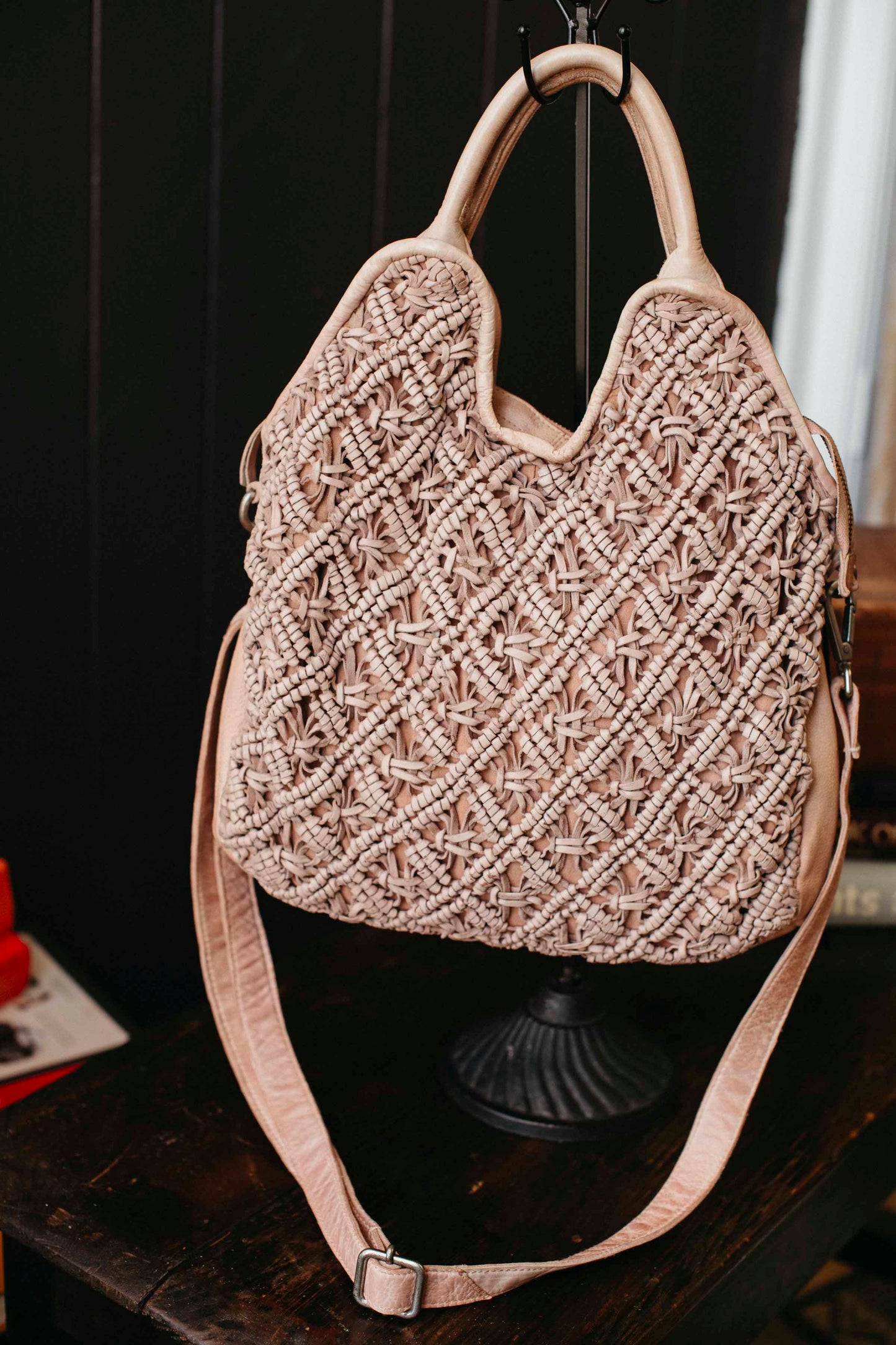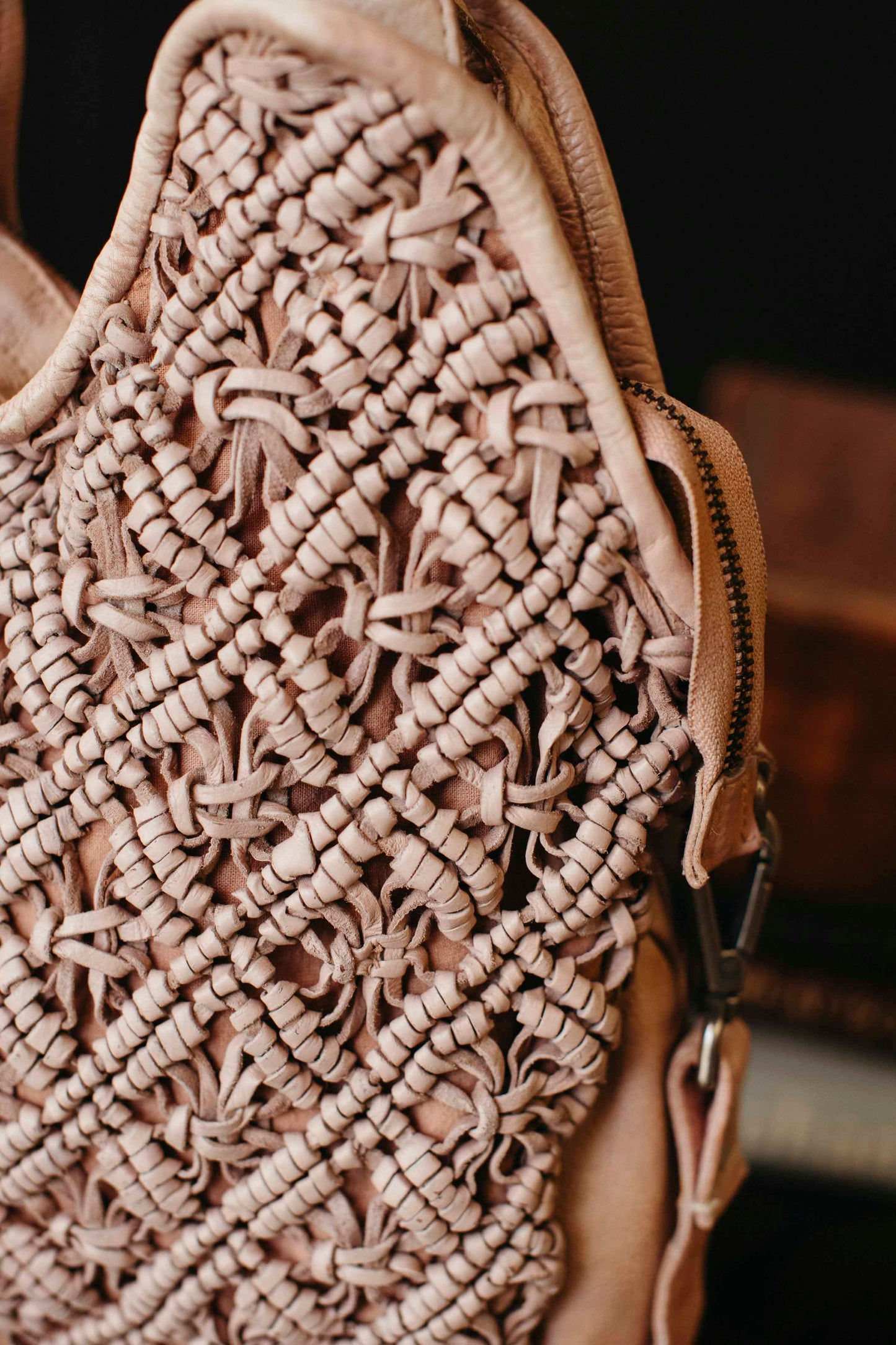- Hand-woven leather macrame façade