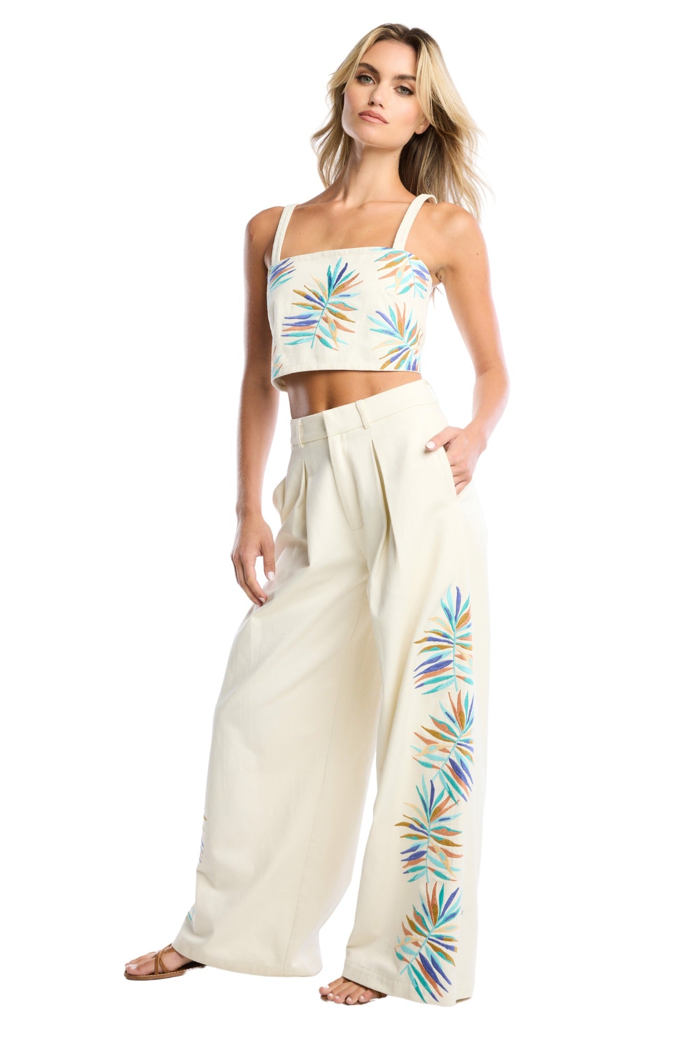 The Hutton Pants are cut in a medium weight cotton twill and adorned with colorful palm embroidery down the sides. Featuring a fixed waistband and fly closure, pressed pleats lead into a dramatic wide leg shape. Pairs perfectly with the matching Tyra Crop Top.