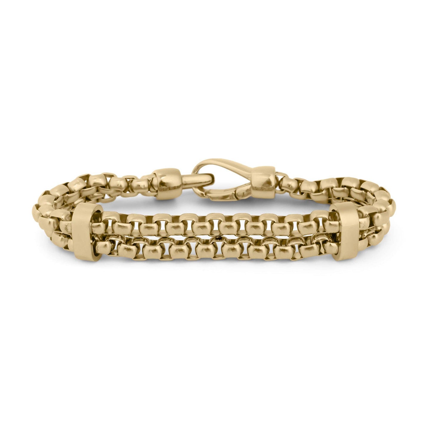 Bold and eye-catching, the 18K Gold PVD Double Chain Metal Clasp Bracelet features two sleek, interwoven chains secured by a sturdy metal clasp for a modern, layered look. Crafted from high-quality stainless steel and finished with a radiant 18K gold PVD coating, this bracelet offers both style and durability. Whether worn solo or stacked, it adds a statement-making edge to any outfit.