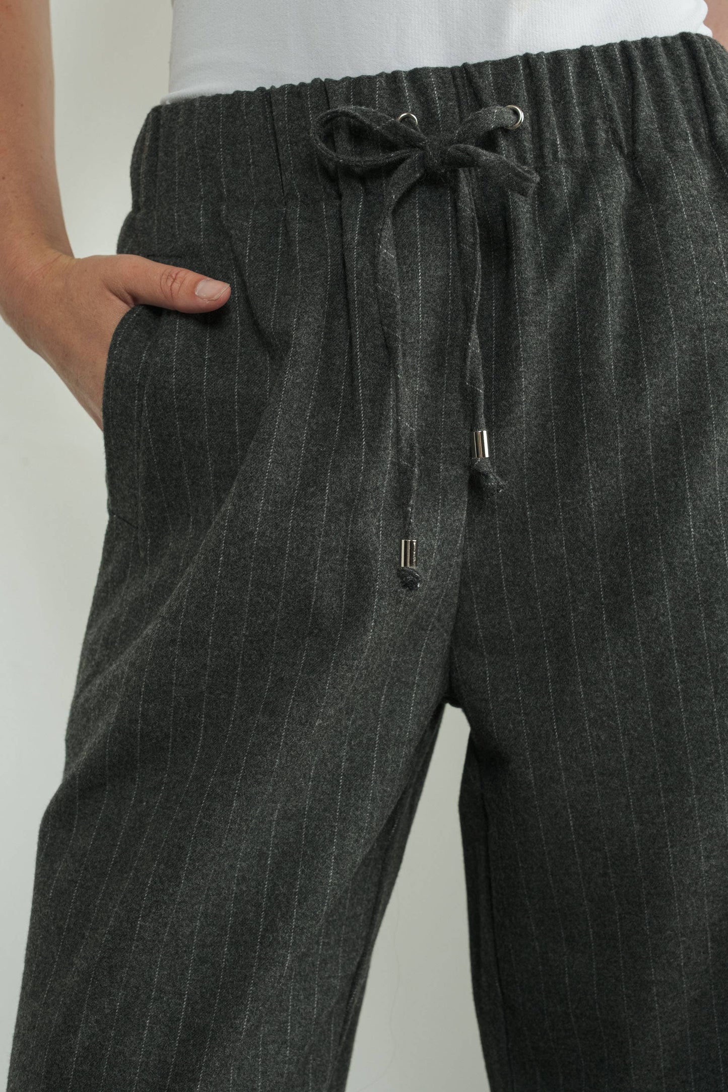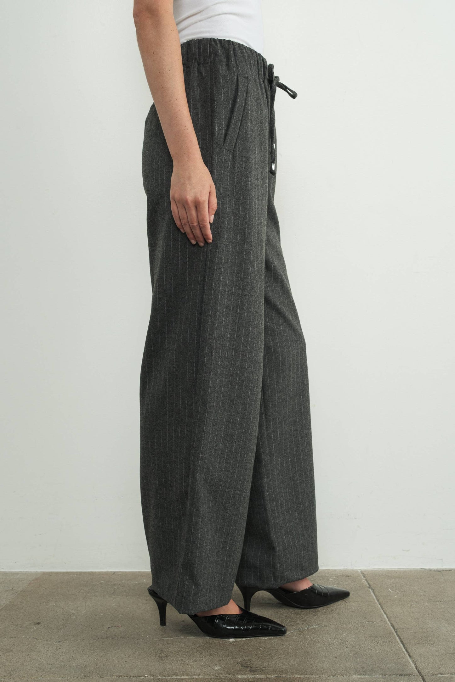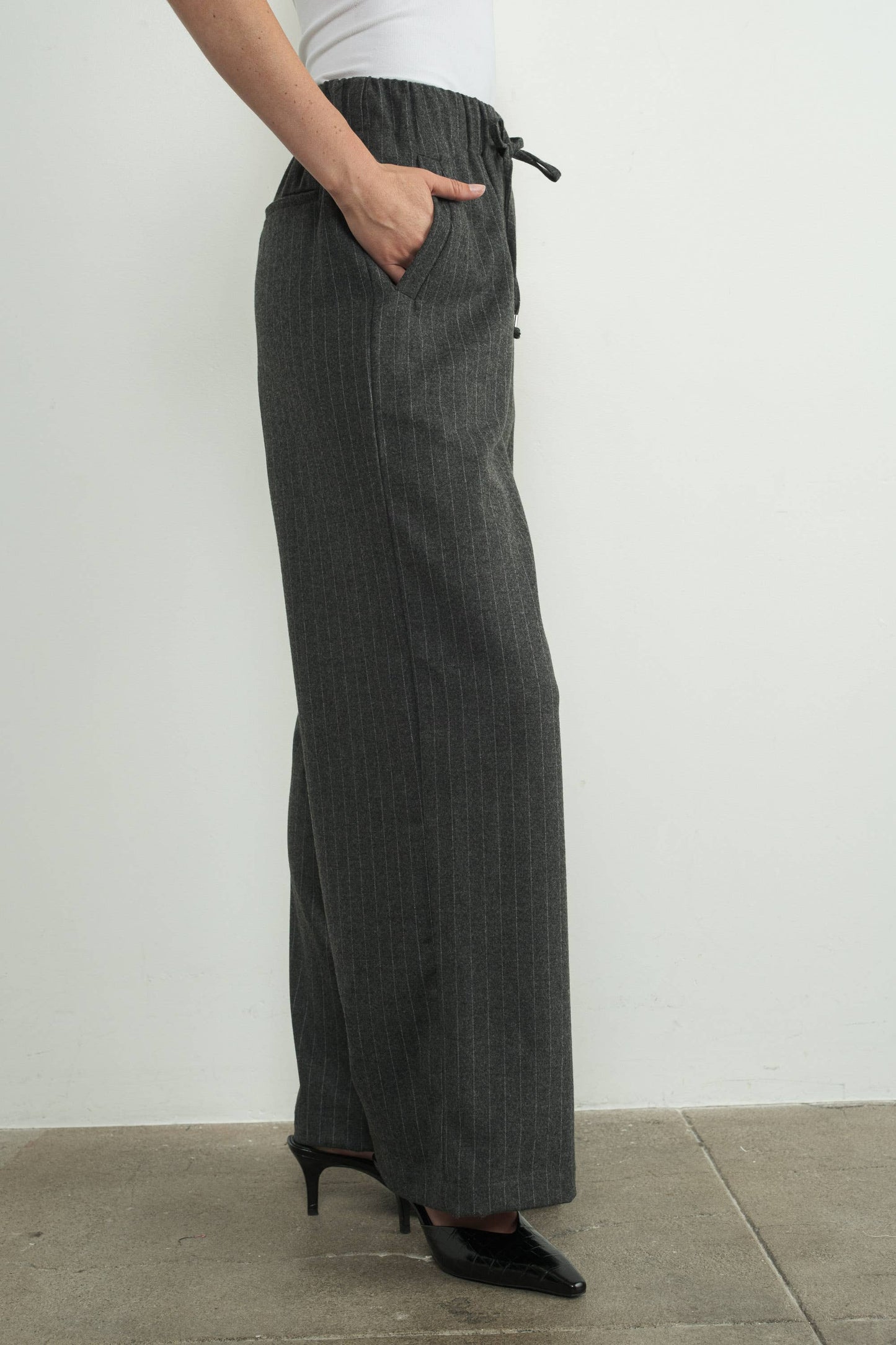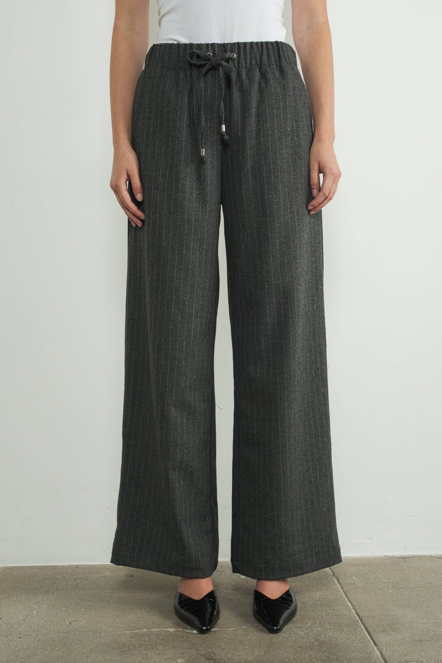 These effortlessly pinstripe tailored pants features an elastic waistband with a drawstring tie, The wide-leg silhouette and subtle pinstripe design create a timeless.