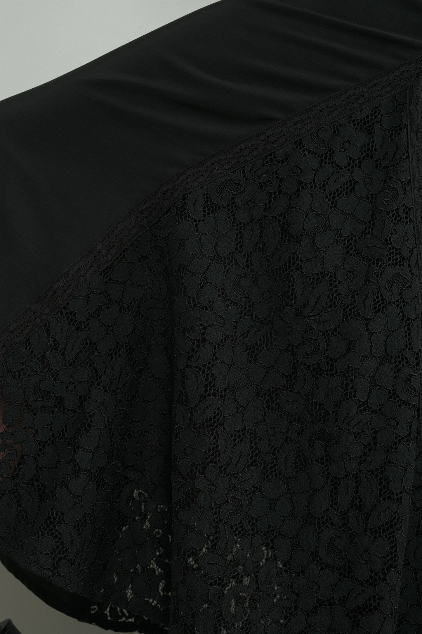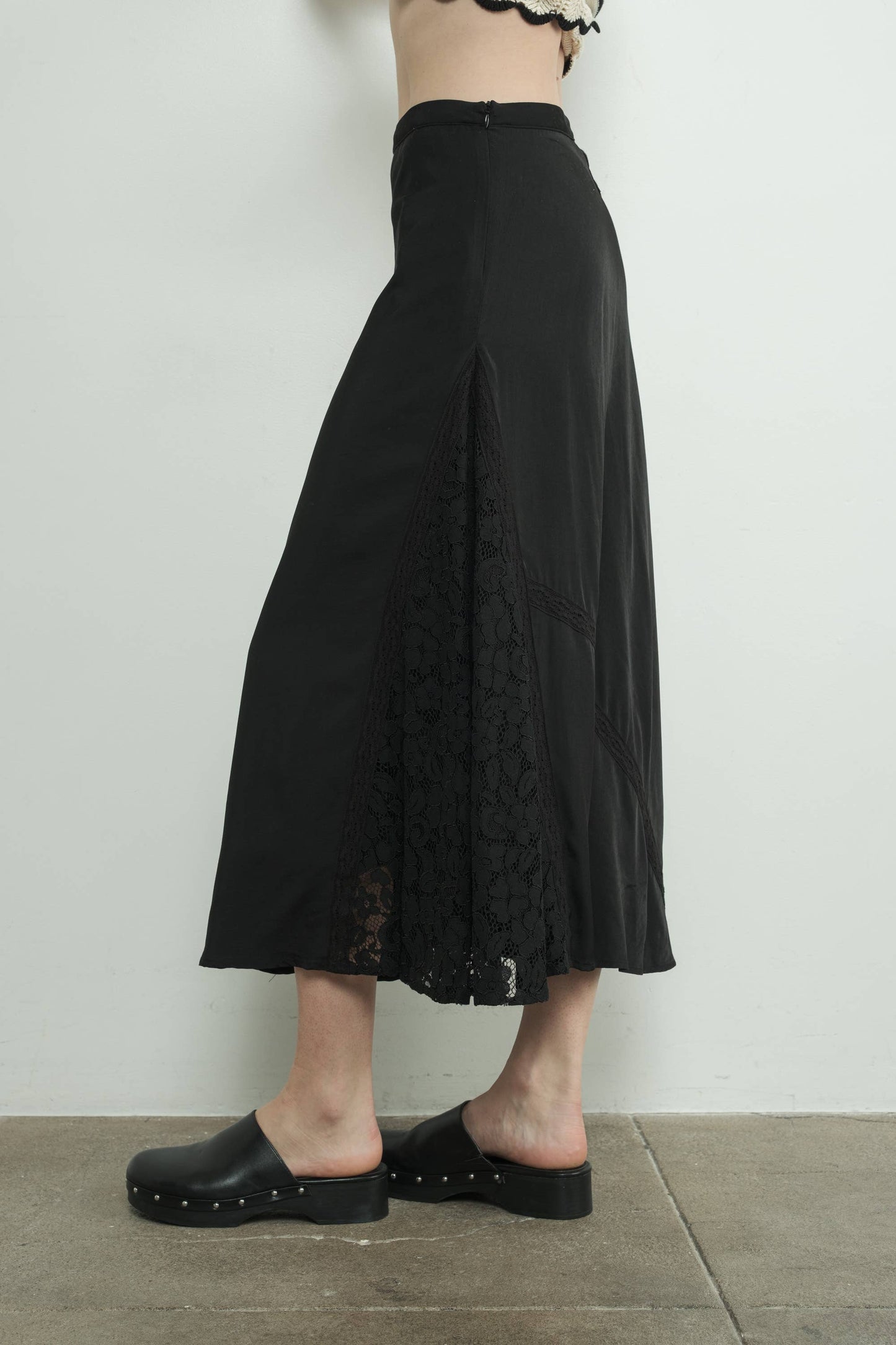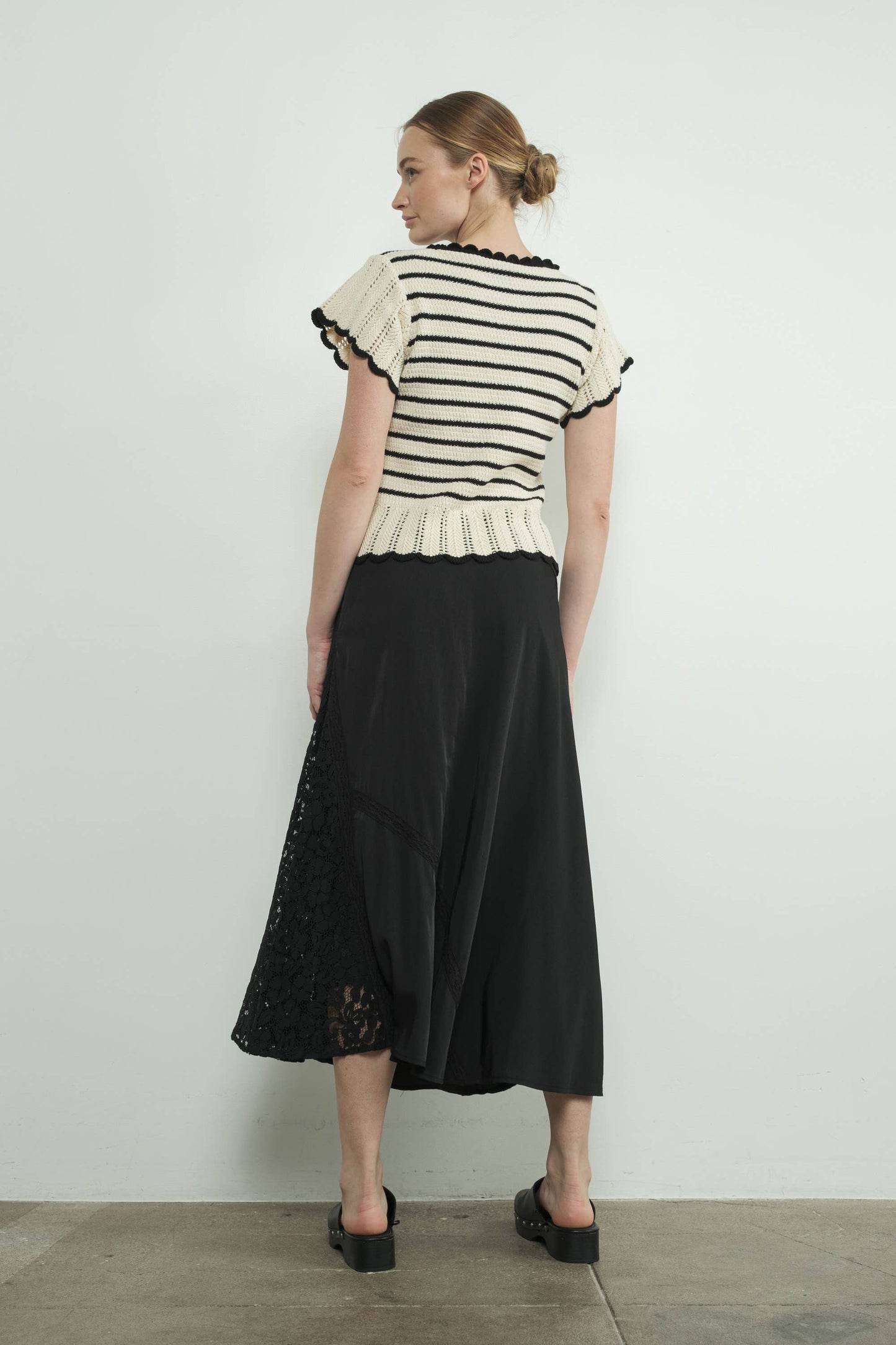 This midi skirt features intricate lace inserts that add a touch of femininity to its flowy silhouette. The soft, breathable fabric is fully lined, offering comfort and ease for all-day wear. The asymmetrical lace panel creates a sophisticated design, perfect for both casual and formal occasions.
