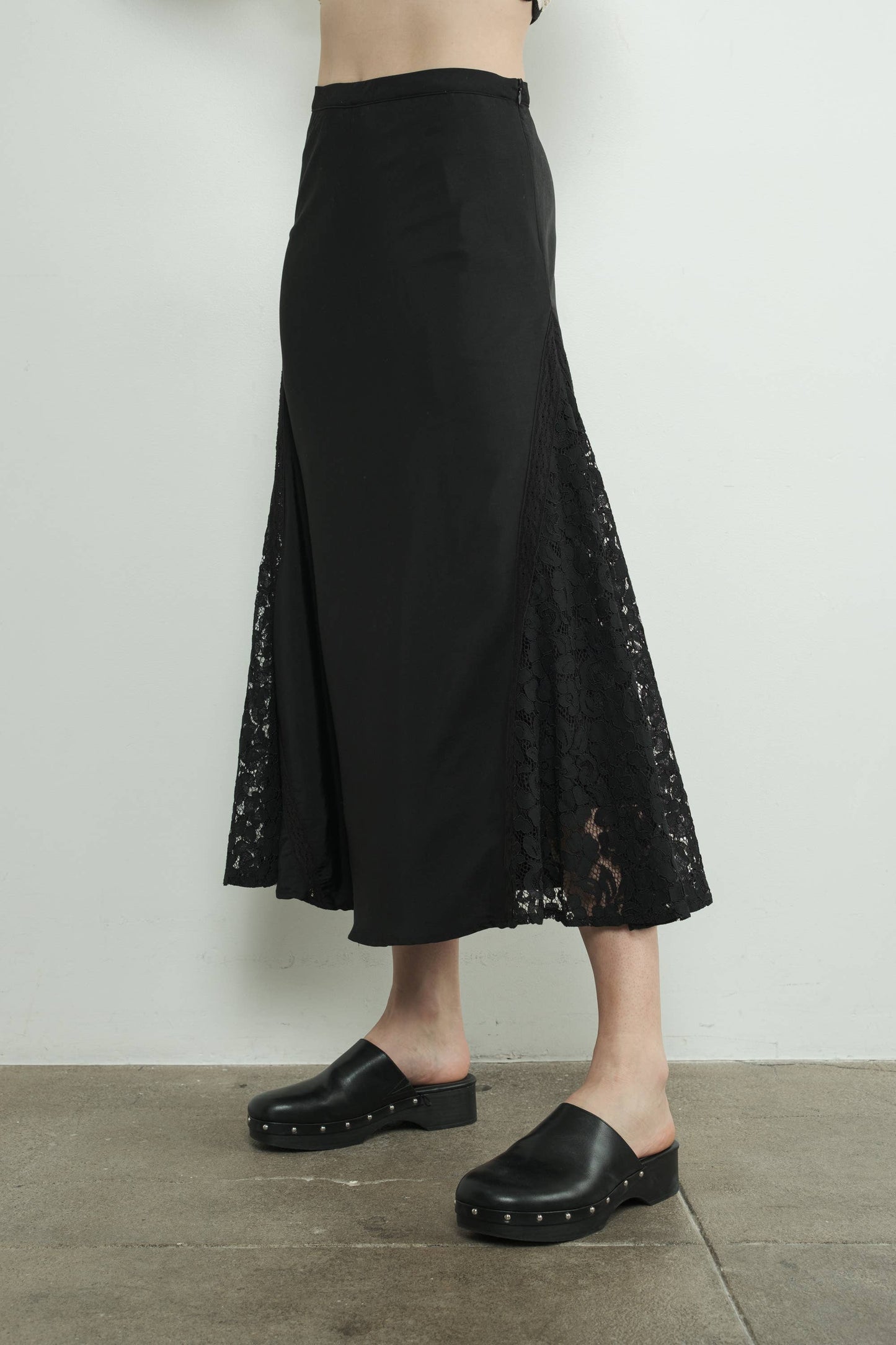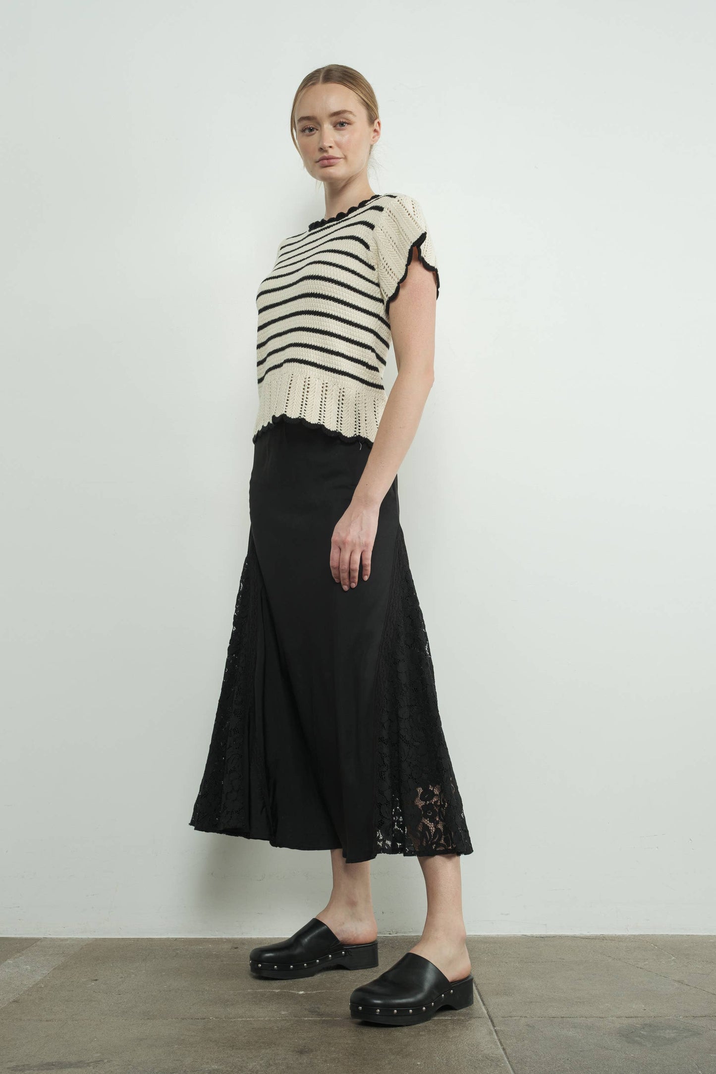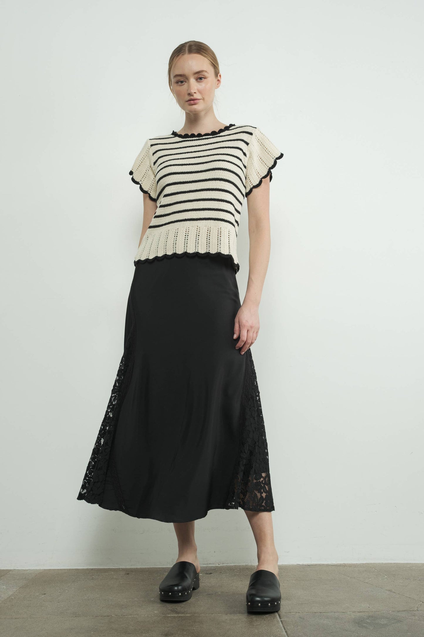 This midi skirt features intricate lace inserts that add a touch of femininity to its flowy silhouette. The soft, breathable fabric is fully lined, offering comfort and ease for all-day wear. The asymmetrical lace panel creates a sophisticated design, perfect for both casual and formal occasions.