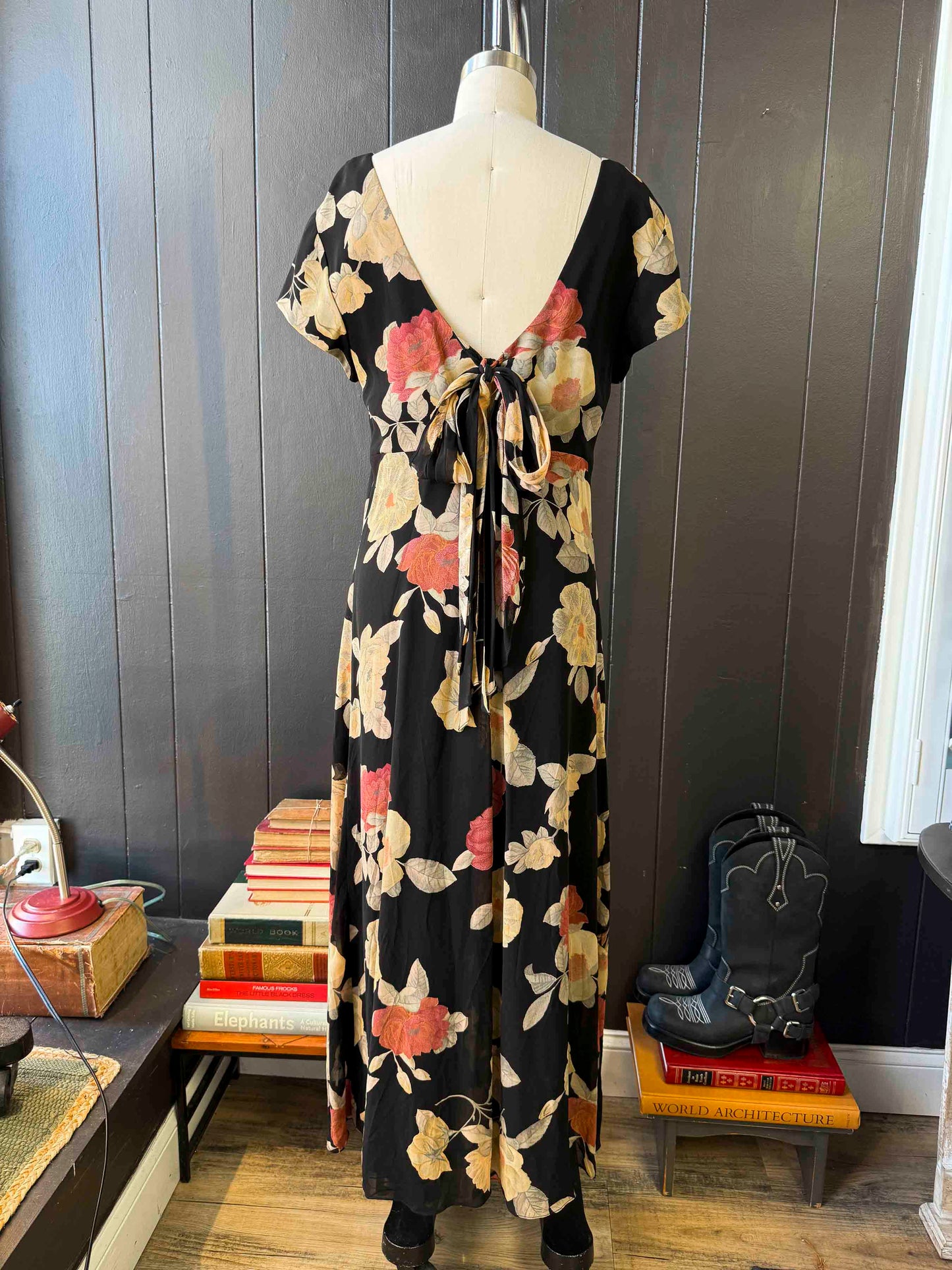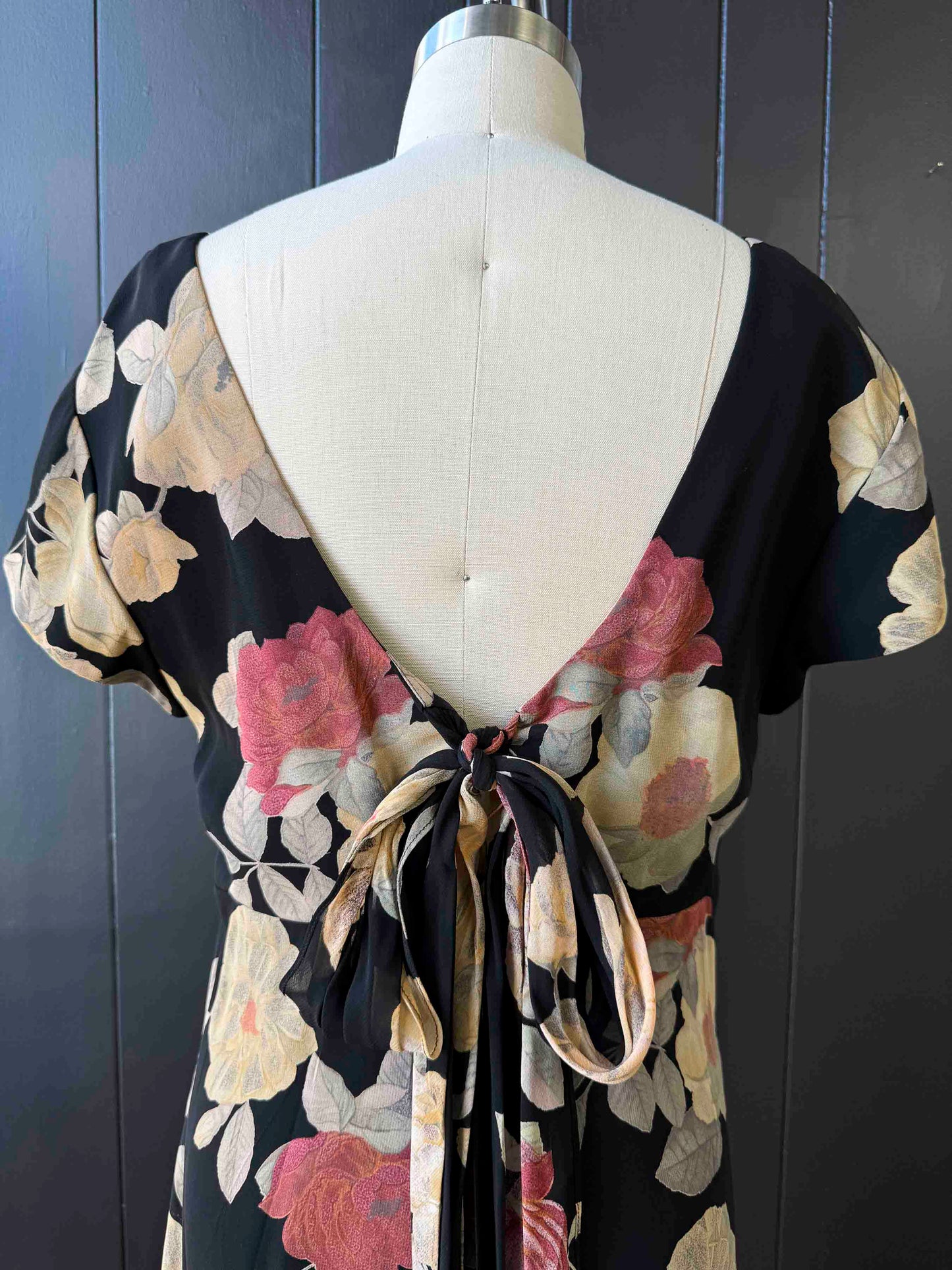 Pre-loved Black Gold & Pink Tie-back Floral Maxi Dress - Size M
